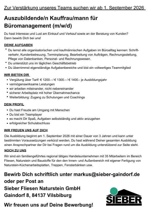 Auszubildende/n Kauffrau/mann für Büromanagement (m/w/d) - Sieber