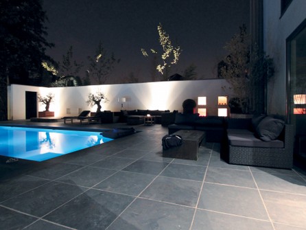Der spaltraue Schiefer „Mondial“ prägt diese Nachtaufnahme