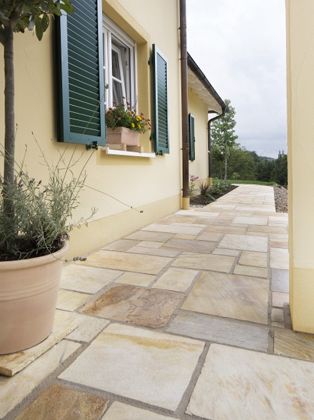 Stilsicher passt dieser Sandstein in geflammter Oberfläche perfekt zu zeitgemäßer Architektur.