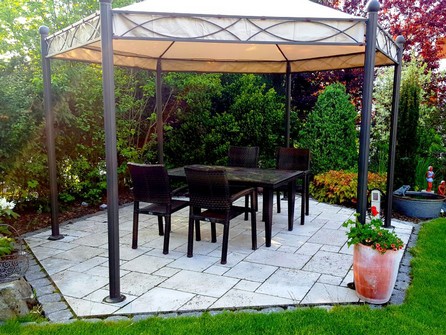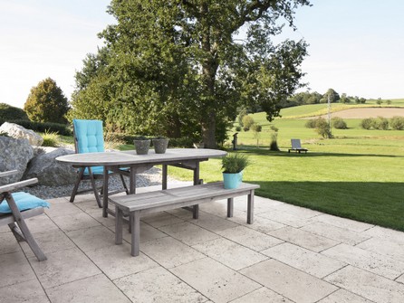 Durch sein dezentes Farbspiel in Grau-Nuancen ist er im Gartenbereich unbegrenzt mit modernen